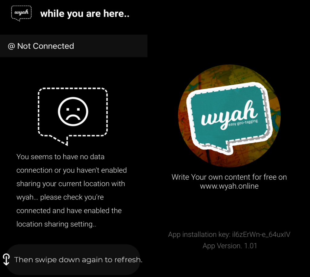 To save you bandwidth and battery life, wyah does not automatically refresh your position and the feed. Simply use the swipe down gesture on your feed page and wyah will update your position and the feed. Alternatively use the sleep mode explained furhter below.