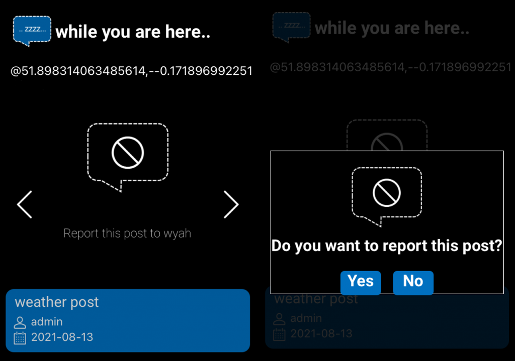 Reporting a post is easy. Simply swipe to the last post slide (or use the right arrow) and click on the “Report this post to wyah” icon. Confirm your selection with “Yes”.
